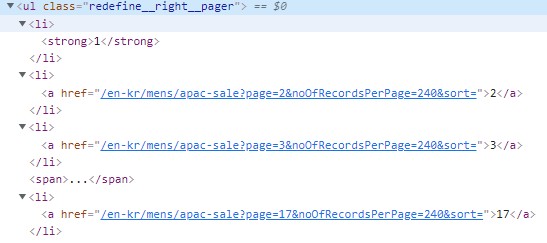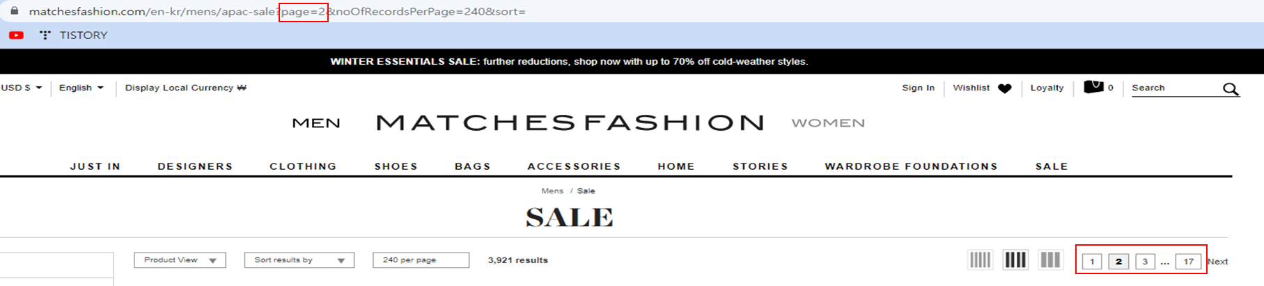 웹 페이지 url을 확인해보니 2번째 페이지를 클릭하면 https://www.matchesfashion.com/us/mens/apac-sale?page=2&noOfRecordsPerPage=240&sort=